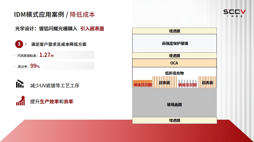 为达成客户目标,我们首先将框贴升级为全贴合,用低折填充胶与 OCA 取代空气层,使镜片直接满足 FDA 的落球标准。为了将透过率提升至 99%,我们重新设计了增透膜结构,在玻璃基底与低折胶之间增加新型膜层,从而实现高透过率。