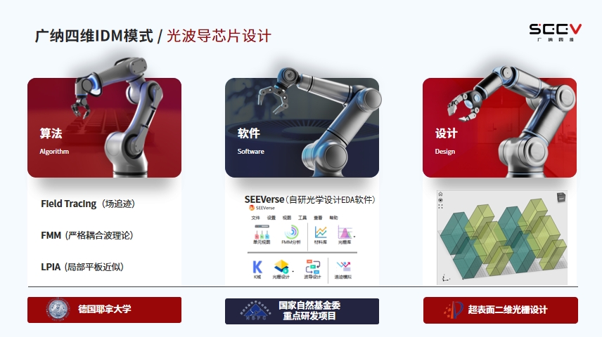 在设计环节,它并不是简单的结构设计,而是由多层能力构成。最底层是算法,包括严格耦合波理论(FMM)、场追迹算法(Field Tracing) 以及局部平板近似(LPIA) 等方法。这些核心算法很多来自德国耶拿大学。在完成理论创新之后,我们将算法沉淀为自研软件 SEEVerse。今年 SEEVerse 已获得国家自然基金委重点研发项目支持,我们也会在软件能力上持续投入,与产业伙伴共享使用。