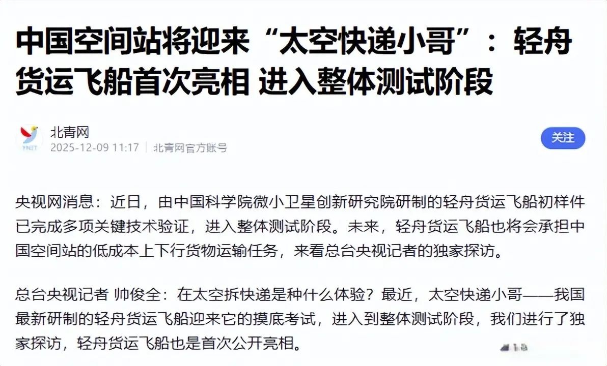 最近刚公开亮相的轻舟货运飞船,看着小巧却藏着大本事,它由中科院微小卫星创新研究院研制,现在已经进入整体测试阶段,马上就要开启“太空快递”生涯。